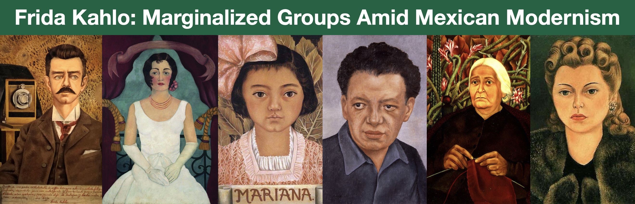 Header artwork credit: Frida Kahlo (left to right): Portrait of My Father, 1951; Portrait of a Woman in White, circa 1930; Portrait of Mariana Morillo Safa, 1944; Portrait of Diego Rivera, 1937; Portrait of Dona Rosita Morillo, 1944; Portrait of Natasha Gelman, 1943